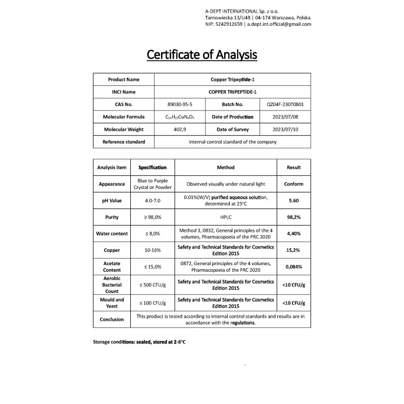 Attention : les emballages du lot actuel peuvent comporter une information erronée concernant la concentration en peptide de cuivre. La teneur réelle en GHK-Cu, vérifiée par des analyses, est de 16 %. Les rapports de laboratoire détaillés confirmant ces paramètres sont disponibles dans la galerie photos.