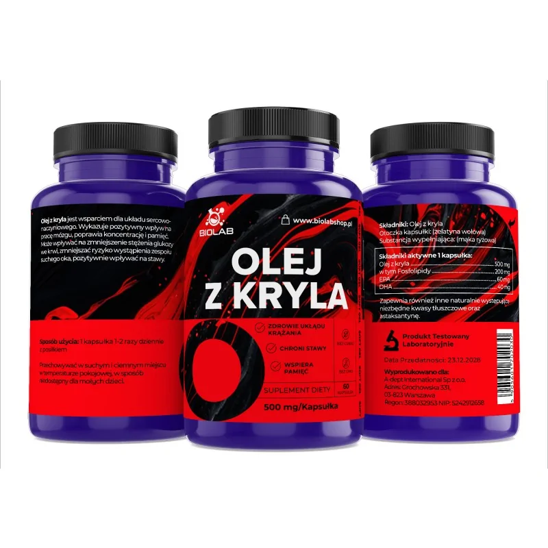 Composition : Huile de krill 500 mg (dont phospholipides 200 mg, EPA 60 mg, DHA 40 mg), enveloppe de la gélule (gélatine bovine), excipient (farine de riz)